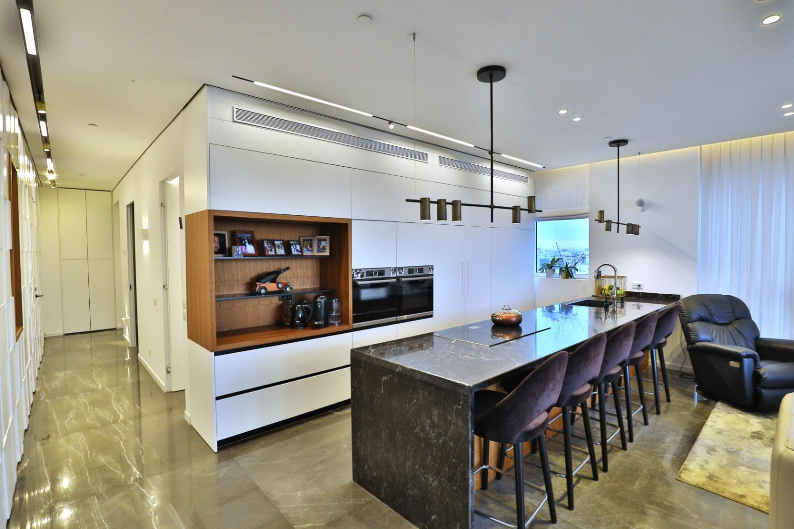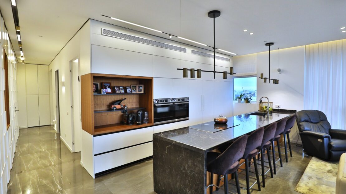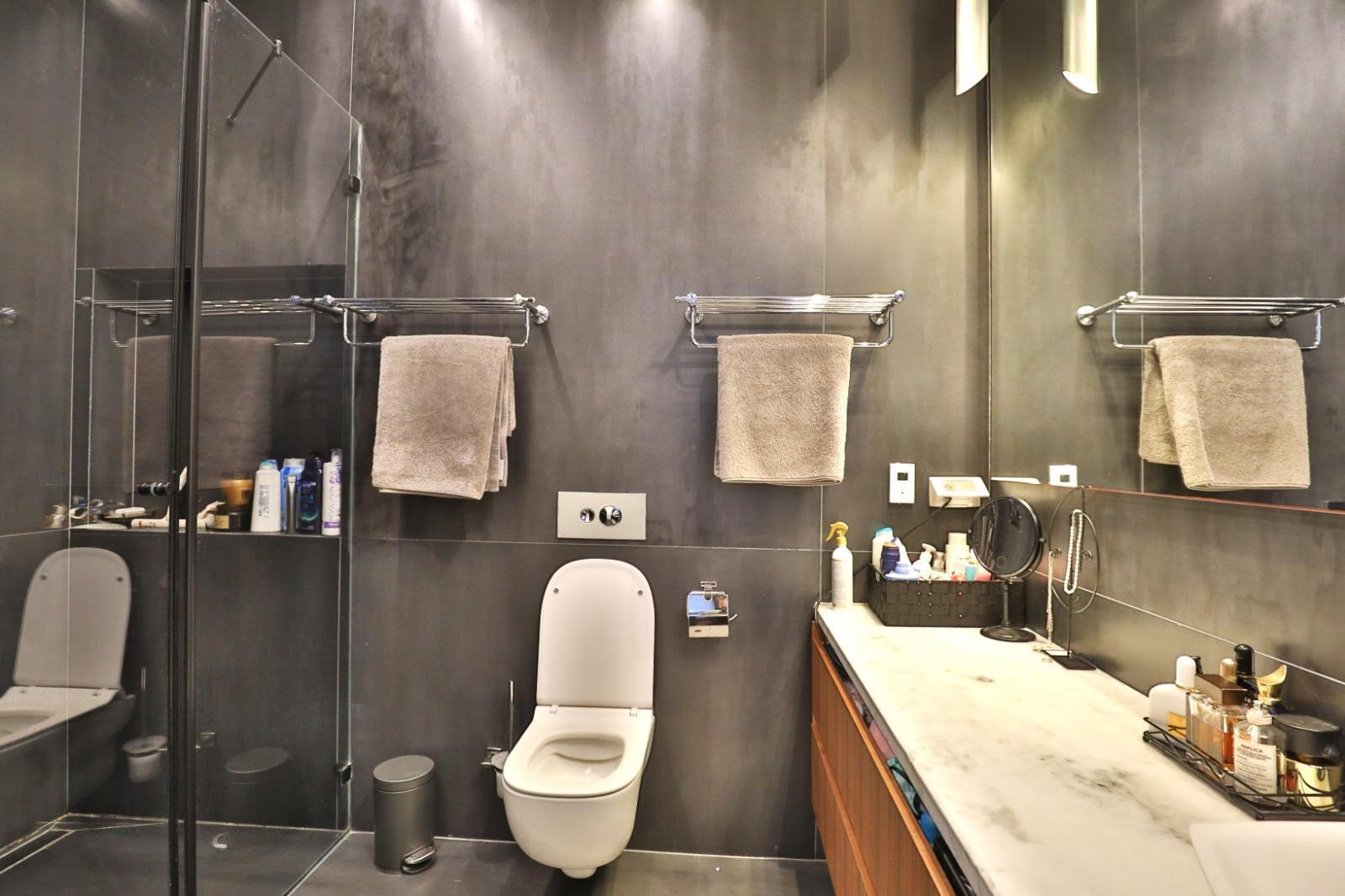 The mini penthouse spans approximately 180 square meters, plus a balcony of about 30 square meters. Originally a 5-room apartment converted into 4 rooms, it features a spacious living area with access to a balcony equipped for a barbecue, an open kitchen, 3 bedrooms including a large master suite with a private bathroom, and another bedroom with its own bathroom. It also includes two parking spaces.