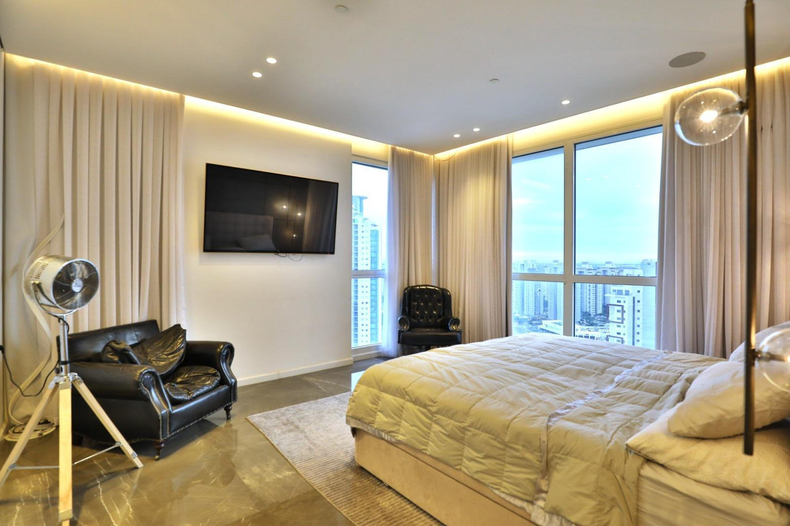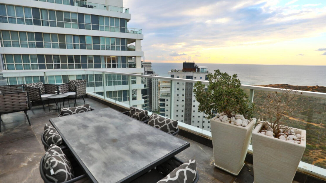 This furnished and fully equipped mini penthouse is situated on a high floor in a 24-story tower in the city of Yamim – one of the most prestigious and sought-after neighborhoods in Netanya. Just a few steps from the sea, the lively Piano shopping center, and a city exit that provides easy access to various points in Israel.