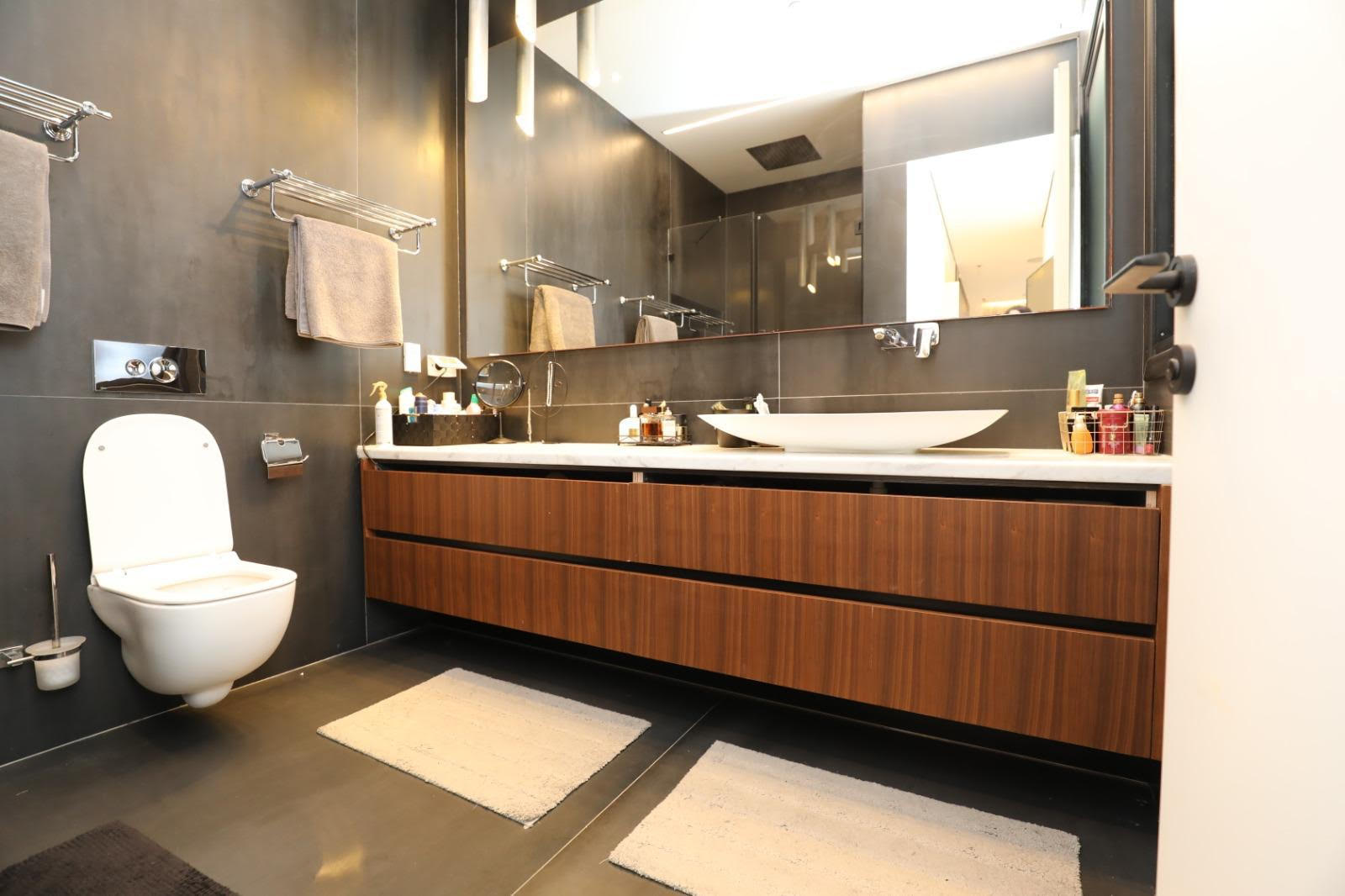 The mini penthouse spans approximately 180 square meters, plus a balcony of about 30 square meters. Originally a 5-room apartment converted into 4 rooms, it features a spacious living area with access to a balcony equipped for a barbecue, an open kitchen, 3 bedrooms including a large master suite with a private bathroom, and another bedroom with its own bathroom. It also includes two parking spaces.